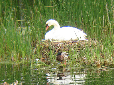 The wind blew strong across the park pond on Friday 22nd accompanied at times with some heavy bursts of rain. The main noteworthy sight on the pond was an abandoned nest of mute swans eggs. Both adults were still present but the female was preening while the male was feeding. It has not been too much of a surprise since it was first noticed several months ago that the female was a young bird and didn't seem to have much maternal instinct.