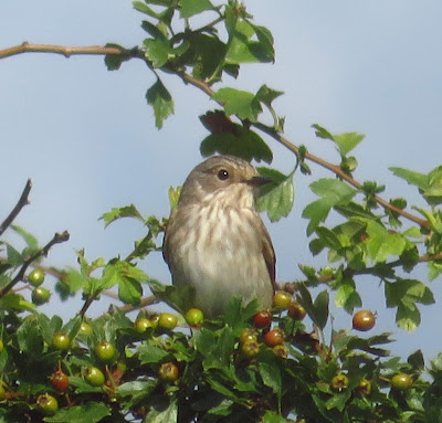 In the dull drizzly conditions on Wednesday, two spotted flycatchers were in the "flycatcher-corner" along the side of the Firs Chase caravan site. Two willow warblers, lesser whitethroat, 50 goldfinches and a sparrowhawk also seen here.