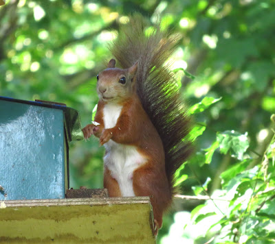 Earlier on Monday 15th, this male red squirrel with dark ear tufts was a new visitor to the Firs Chase garden feeder. Lately there have been regular visits by a male with no ear tufts and a scruffy tail.
