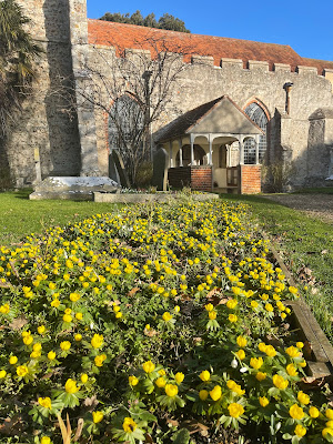 A nice display of winter aconites in front of East Mersea church was buzzing with over a dozen honey bees on Thursday.
