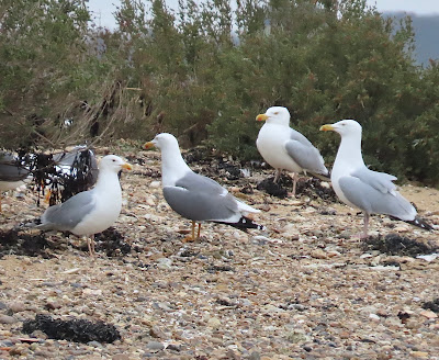On Wednesday 9th a yellow-legged gull was seen on Packing Marsh Island, seen here in the middle beside some herring gulls with their slightly paler-grey wings and back. The three herring gulls are showing the pale-pink coloured legs.